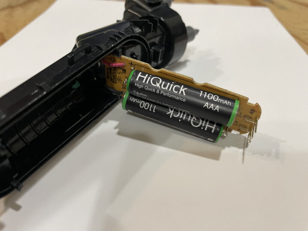 内蔵されているバッテリーは単4電池と同等のようですので、汎用の充電タイプの単4電池を購入して交換しました。